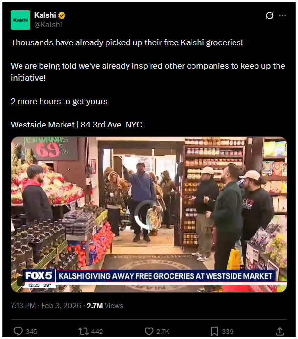 A Kalshi kedden több mint ezer embernek kínált ötven dollár értékű bevásárlást Manhattanben, míg a Polymarket bejelentette, hogy a következő héten megnyitja New York első ingyenes élelmiszerboltját.