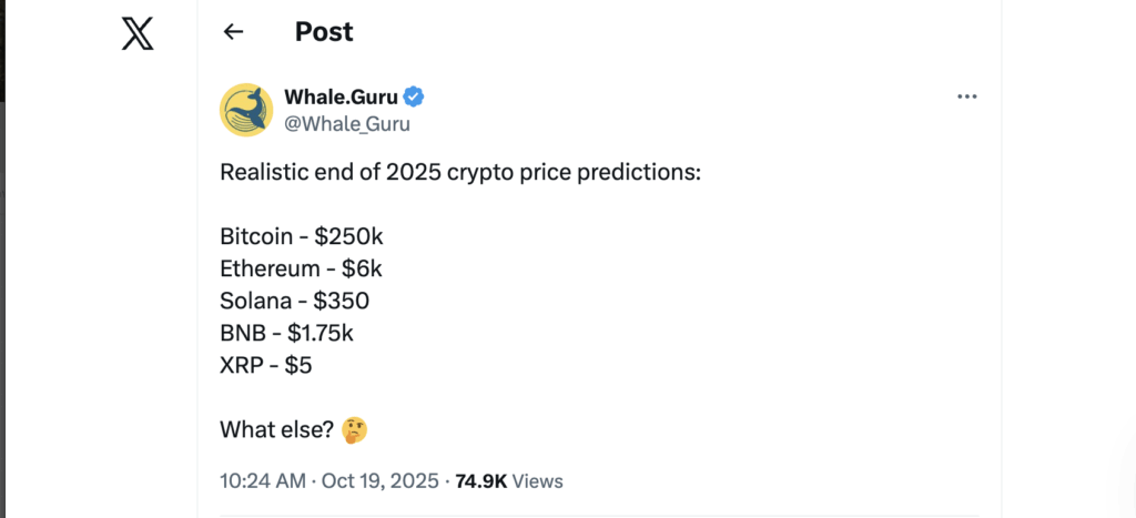 A piaci elemző Whale.Guru, akit sokan a „100x Gem Hunter” néven ismernek, közzétette legfrissebb árjóslatát a vezető kriptovalutákra – köztük a Bitcoinra és az XRP-re –, amely meglepően reális képet fest a 2025 végére várható kilátásokról.