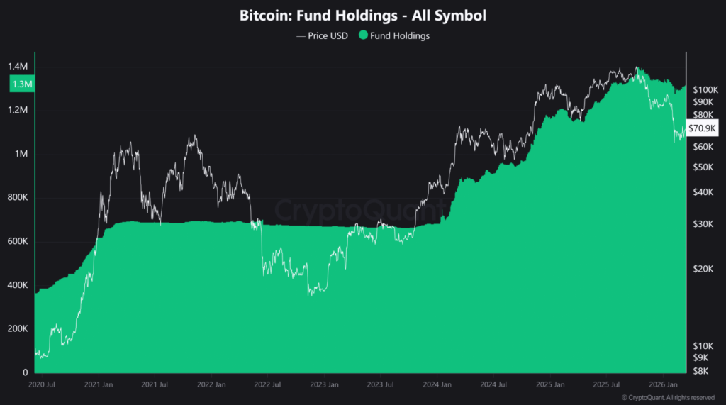 A CryptoQuant adatai szerint az ETF-ek letétkezelői jelenleg körülbelül 1,3 millió BTC-t tartanak, ami a teljes forgalomban lévő kínálat 6,7%-ának felel meg.