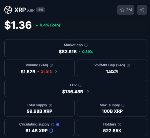 Az XRP token jelenleg körülbelül 1,30–1,36 dolláron forog, ami több, mint 50%-os esést jelent a 2025-ös csúcshoz képest.