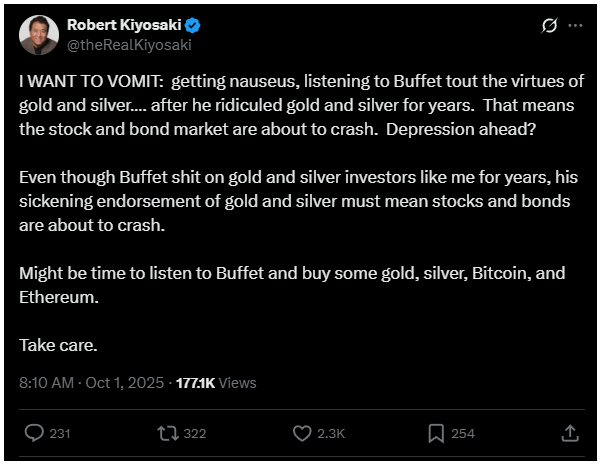 „Buffett évekig szidta az arany- és ezüstbefektetőket, mint engem. Ha most mégis ezeket támogatja, az csak egy dolgot jelenthet: a részvény- és kötvénypiac összeomlás előtt áll. Talán ideje venni egy kis aranyat, ezüstöt, Bitcoint és Ethereumot.” – írta az X-en.