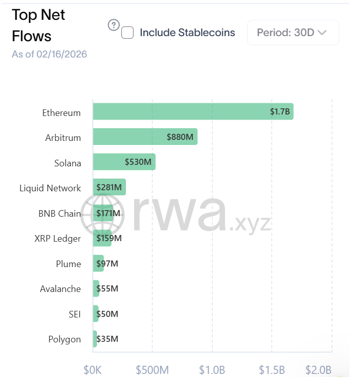 Az RWA.xyz adatai szerint február 16-ig minden jelentősebb blokkláncon nőtt a tokenizált eszközök összértéke.