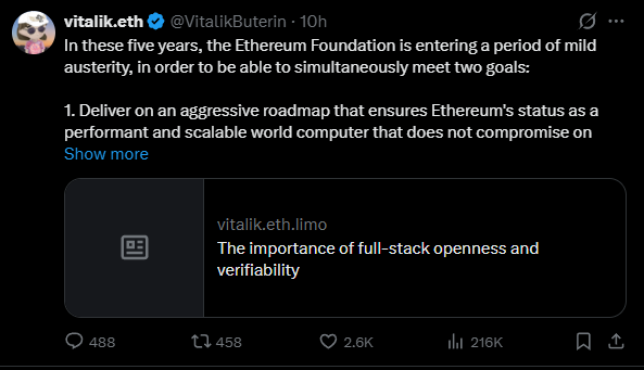 Buterin bejelentette, hogy az EF a következő öt évben „mérsékelt megszorítások” időszakába lép.