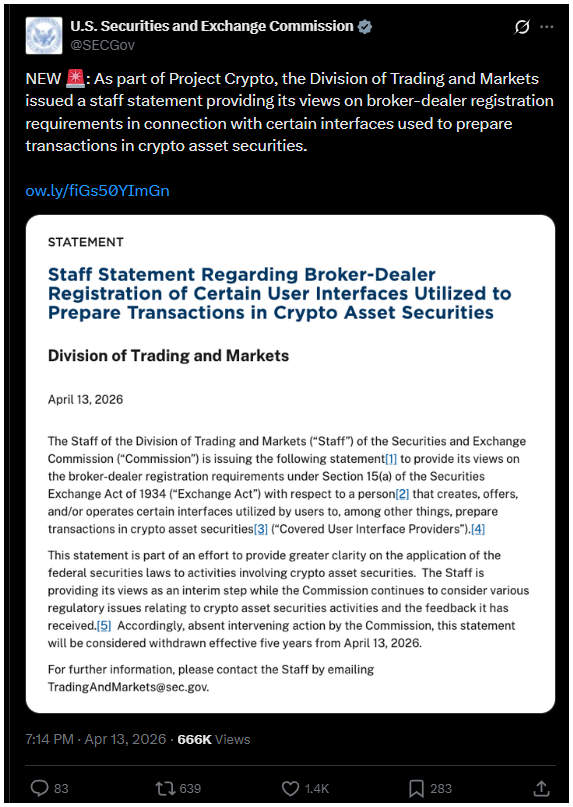 Az SEC Trading and Markets részlegének április 13-i állásfoglalása viszont azt mondja, hogy az úgynevezett „covered user interface” szolgáltatók, például weboldalak, böngészős bővítmények vagy mobilappok, amelyek kriptotárcát használnak és tranzakciókat segítenek elő, nem feltétlenül kötelesek bróker-regisztrációra.