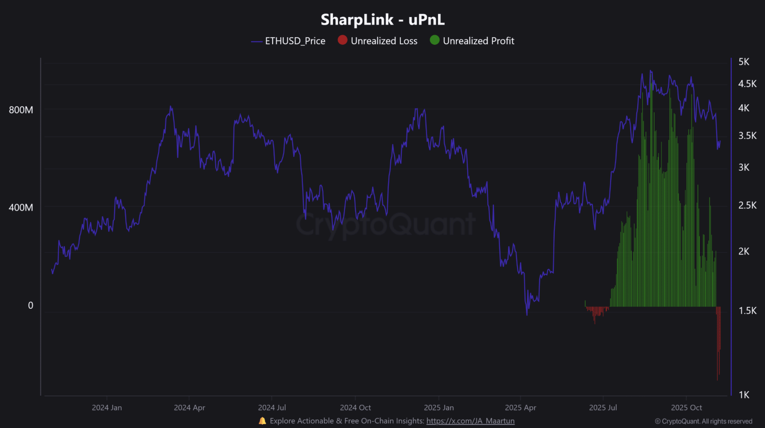 A CryptoQuant adatai szerint a cég 442.000 ETH-t vásárolt október közepe óta, és 2,1 milliárd dollárnyi nem realizált veszteséget cipel magával.