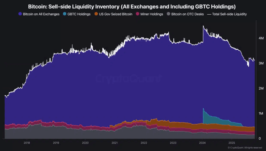 Ennek ellenére a hosszú távú befektetők nem adnak el. 2024 januárja óta a tőzsdéken és OTC pultokon elérhető Bitcoin mennyisége 4,5 millióról 3,1 millióra csökkent.