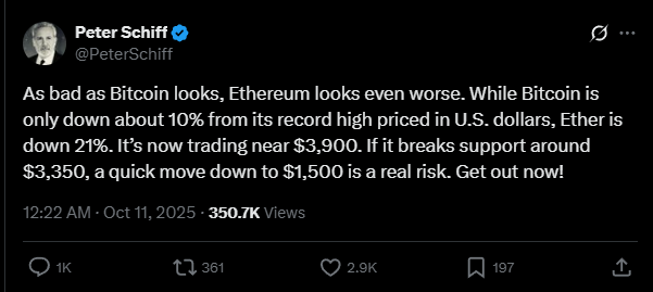 Peter Schiff mindig is a kriptovilág egyik legnagyobb kritikusa volt, de az, hogy most már az Ethereumot is célba vette, azt mutatja, mennyire zavarja a digitális eszközök térnyerése.
