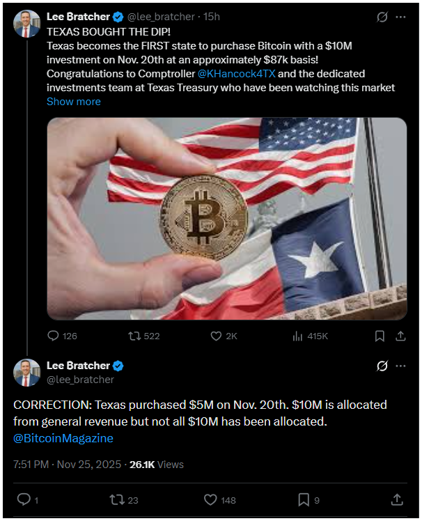 Texas lett az első állam, amely bitcoint vásárolt az infláció elleni védekezésként. Lee Bratcher, a Texas Blockchain Council elnöke bejelentette, hogy az állam 2025. november 20-án 5 millió dollár értékben vett bitcoint.