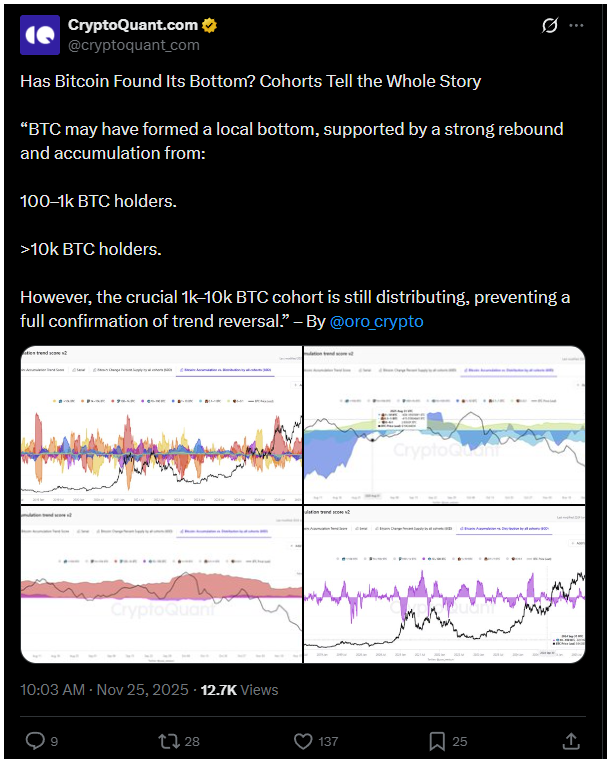 A CryptoQuant megjegyezte, hogy bár a 10.000 feletti és a 100–1000 közötti bitcoin-tulajdonosok gyűjtik az érméket, az 1000–10.000 BTC közötti befektetők inkább eladnak.