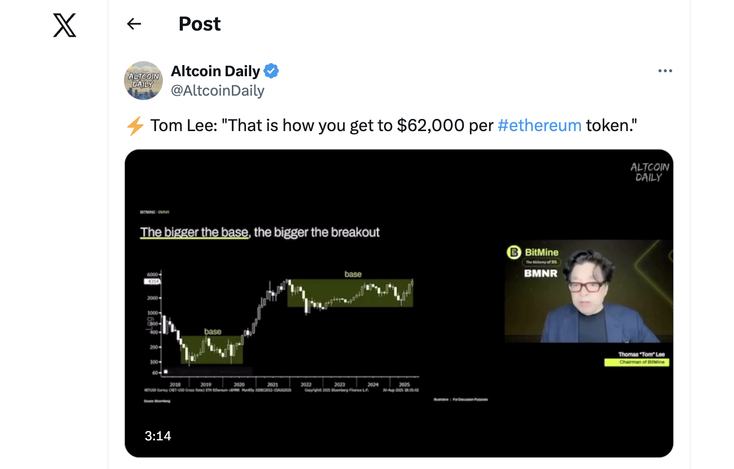 Az Altcoin Daily által megosztott interjúban Tom Lee részletesen bemutatta, hogyan jutott el a 62.000 dolláros Ethereum-célárhoz, amelyet a Wyckoff-módszertan alapján határozott meg.