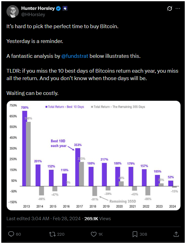 Hunter Horsley, a Bitwise vezérigazgatója is ugyanerre figyelmeztetett: aki lemarad a Bitcoin 10 legerősebb napjáról, az gyakorlatilag a teljes éves hozamról is lemarad.