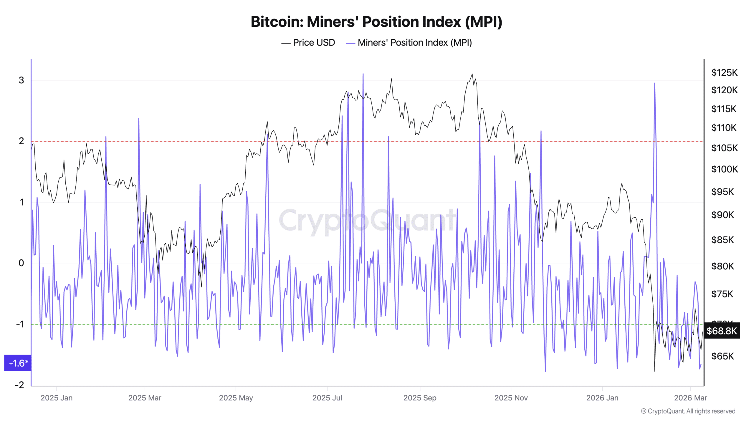 A CryptoQuant „Miners’ Position Index” (MPI) adatai szerint a mutató jelenleg körülbelül -1,6. Ez azt jelzi, hogy a bányászok BTC‑átutalásai a tőzsdékre a szokásosnál alacsonyabbak.