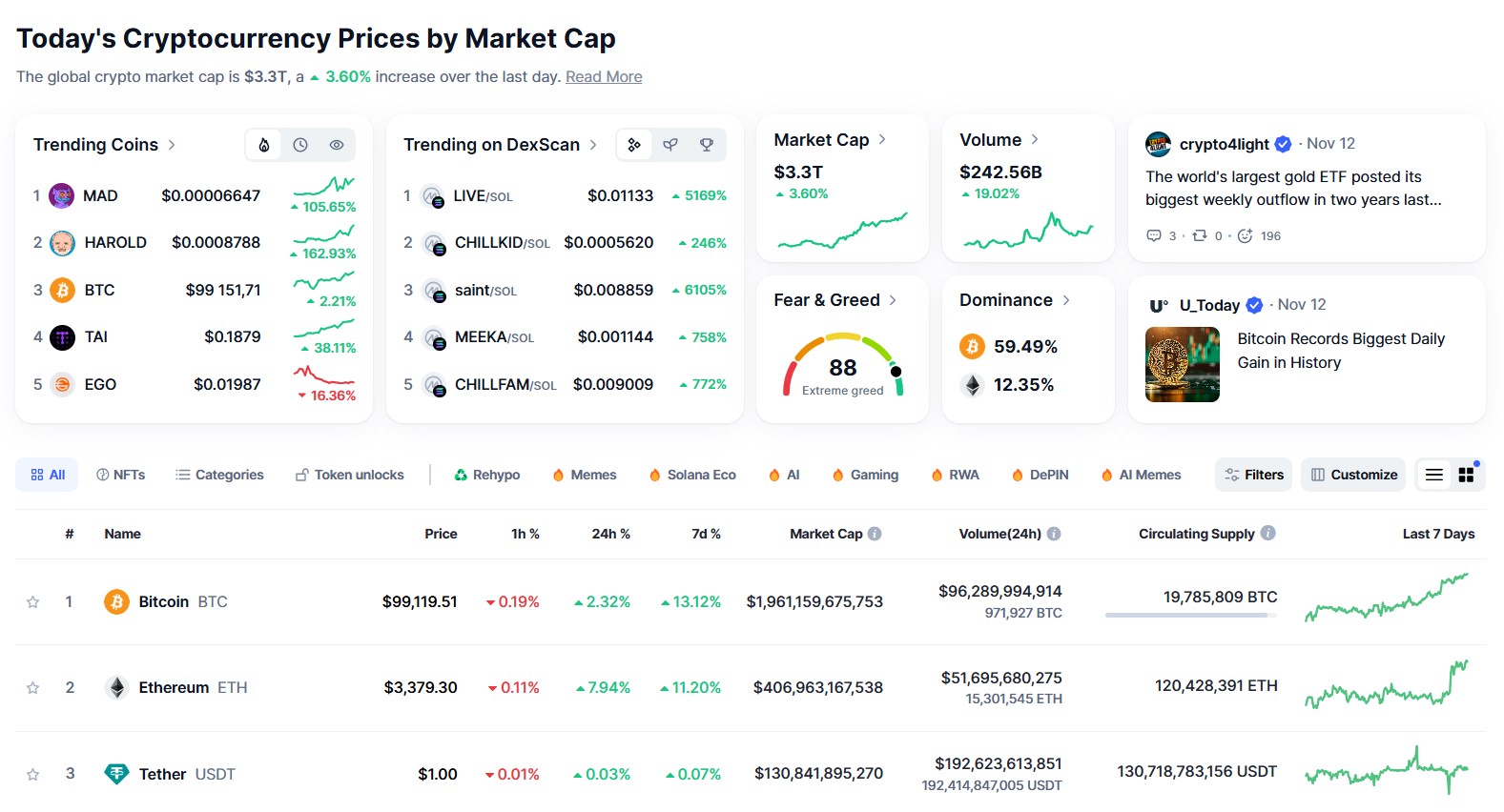 Az eredmény pedig lenyűgöző: a Bitcoin árfolyama a választások óta rengeteget emelkedett, és hamarosan eléri a 100 000 dolláros történelmi csúcsát is. A kriptók piaca soha nem tapasztalt növekedésnek indult, piaci kapitalizációja péntek délelőtt túltesz a 3,3 billió dolláron.