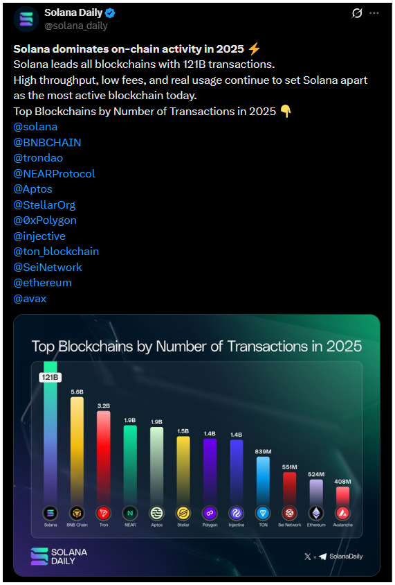 A Solana Daily jelentése szerint a hálózat lenyűgöző, 121 milliárd tranzakciót bonyolított le 2025-ben, ezzel megelőzve más nagy láncokat, például az Ethereumot, a BNB Chain-t, a Tront, a Neart és az Aptost.