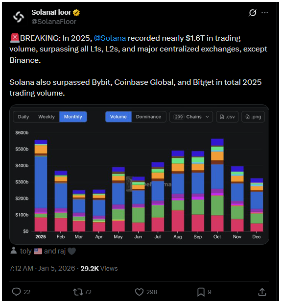 A SolanaFloor az X-en beszámolt róla, hogy a blokklánc 2025-ben közel 1,6 billió dolláros kereskedési forgalmat ért el. Ezzel megelőzött minden vezető 1. és 2. rétegű megoldást.