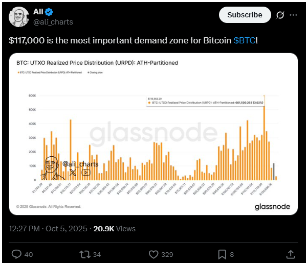 Azonban kiderült, hogy a készletre rakódó költségek gyengültek. Egy X-en közzétett bejegyzésben Ali Martinez kriptoelemző kiemelte, hogy a 117.000 dolláros szint fontos keresleti zóna volt. Ezt az állítást az UTXO realizált ármegoszlása is alátámasztotta.
