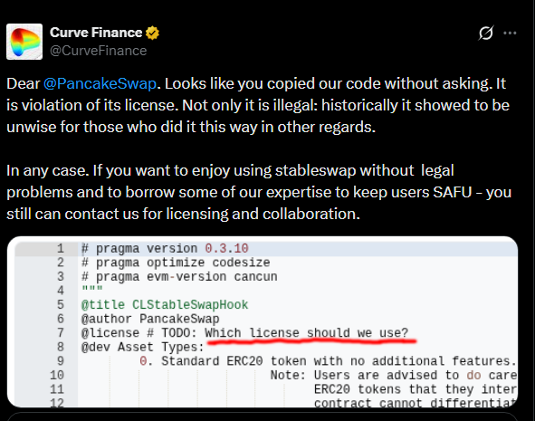 A Curve Finance csapata közösségi médiában jelezte, hogy a PancakeSwap legújabb verziójában, a PancakeSwap Infinityben, olyan kódrészletek jelenhettek meg, amelyek a StableSwap rendszerhez kapcsolódnak.