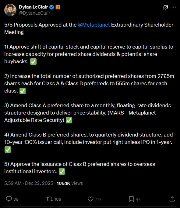 A japán székhelyű bitcoin-tartalékkezelő cég részvényei több mint 4%-kal emelkedtek, miután a részvényesek mind az öt javaslatot jóváhagyták a vállalat rendkívüli közgyűlésén (EGM) december 22-én.