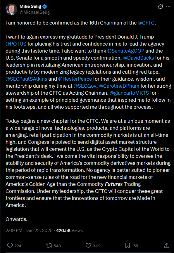 Seliget múlt héten erősítette meg az amerikai szenátus a kinevezési folyamat után. Megköszönte Trump elnöknek, hogy őt választotta az ügynökség vezetésére. Azt mondta, a CFTC új korszakba lép, miközben a technológia átalakítja a pénzügyi piacokat.