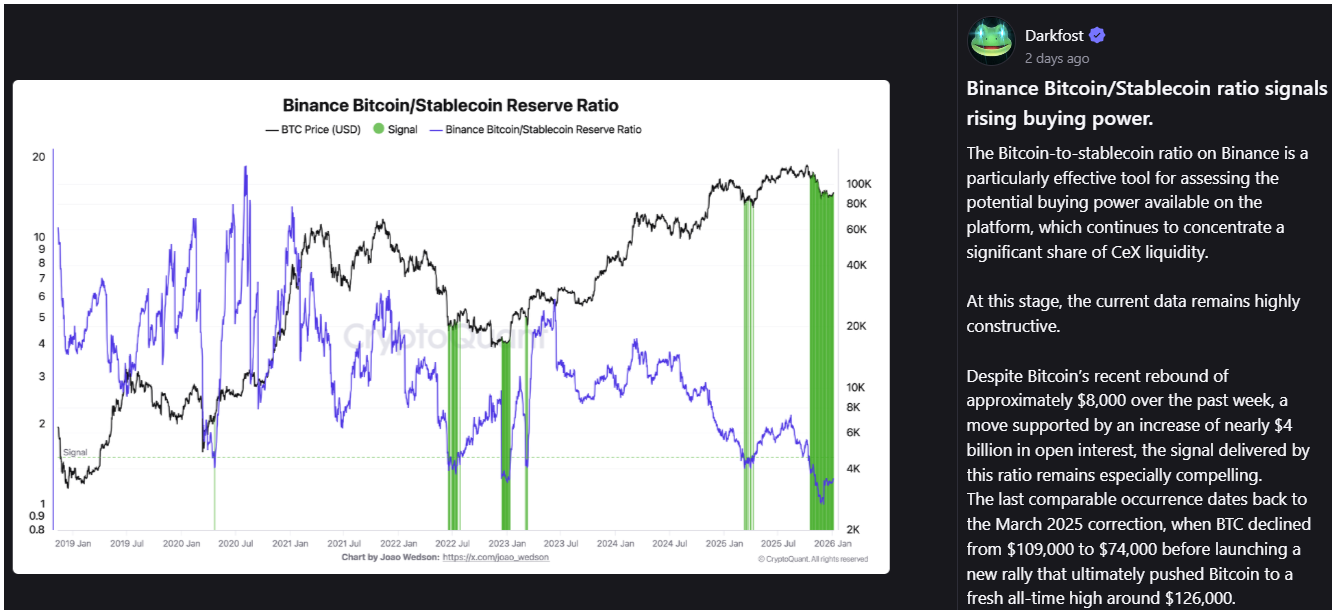 Más piaci adatok vegyes képet mutatnak. Ez arra utal, hogy a bitcoin átmeneti szakaszban lehet. Egyrészt a Binance-en a bitcoin és a stablecoinok aránya növekvő vásárlóerőt jelez.