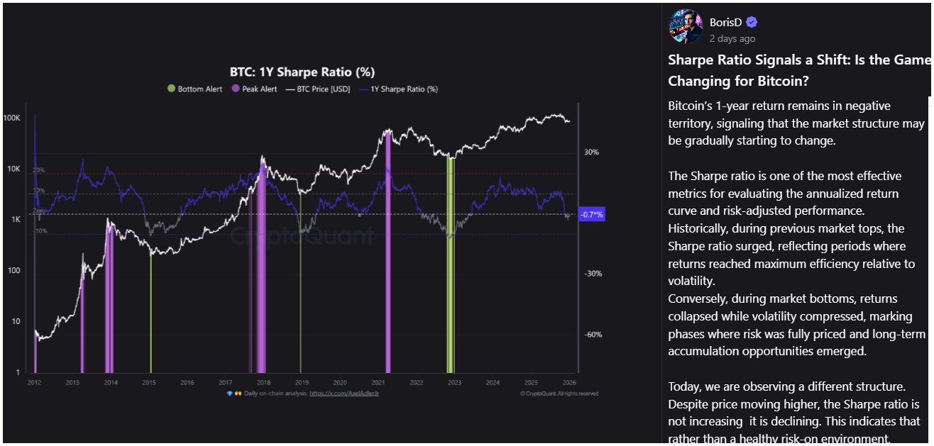 Másrészt BorisD megjegyezte, hogy a Bitcoin Sharpe-mutatója, amely a hozamot a volatilitáshoz viszonyítja, csökken, miközben az ár emelkedik.