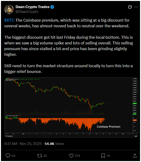 Rámutatott, hogy a Coinbase-prémium, amely hetekig erősen negatív volt, a hétvégén visszatért a semleges szint közelébe, miután a múlt pénteki erős eladások helyi mélypontot értek el.