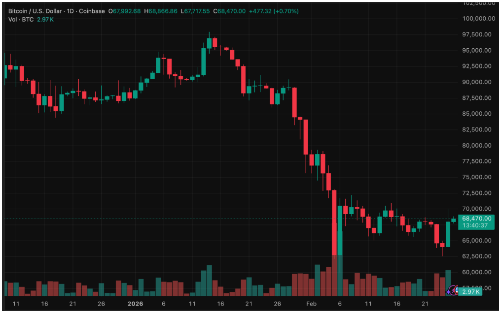 Január 14. és február 5. között a bitcoin ára 35%-ot esett. Azóta 22 napja 60.000 és 70.000 dollár között mozog. Közben a BTC‑elfogadáshoz kapcsolódó mutatók...
