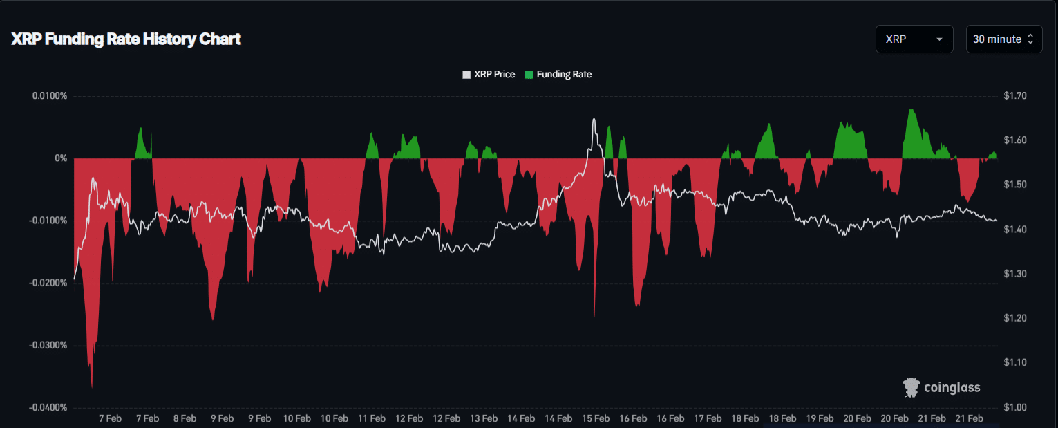 Az XRP februári esése több lépésben zajlott. Először egy éles, 24%-os zuhanás következett be 1,37 dollárig, ami tovább fokozta az eladási nyomást.