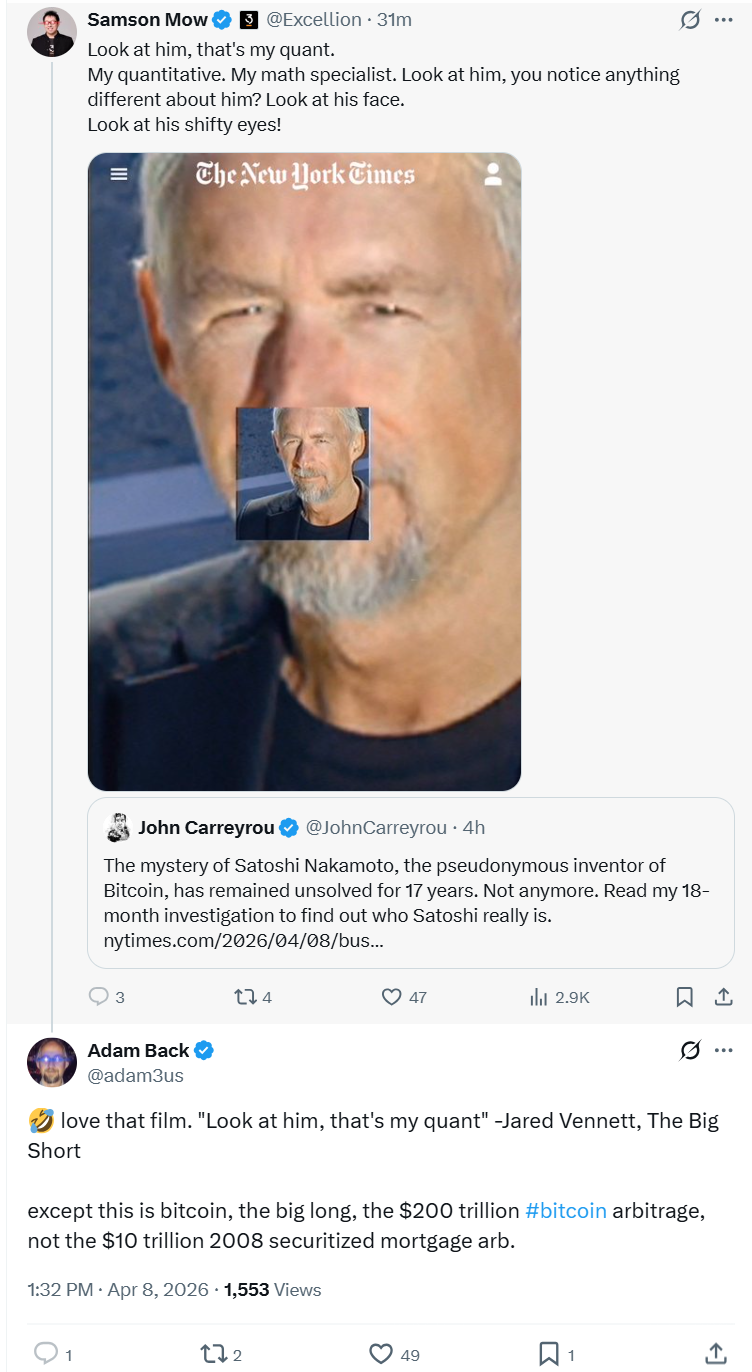 Back visszautasította az állítást, és elmondta, hogy az újságírókat a X-en közzétett bejegyzésére irányította, miután korábban is elutasított hasonló próbálkozásokat, amelyek őt próbálták Satoshiként azonosítani.