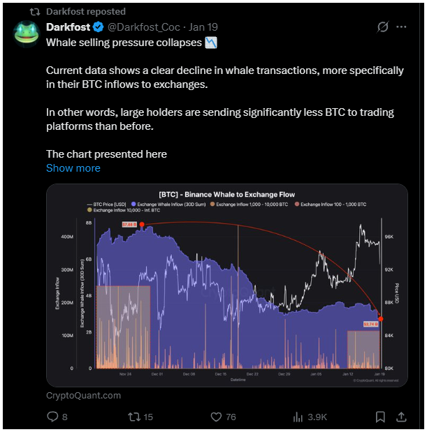 A Frank nevű kriptoszakértő és BTC-piaci elemző jelentése szerint a csökkenő eladási nyomás főként a hosszú távú befektetőknél figyelhető meg.