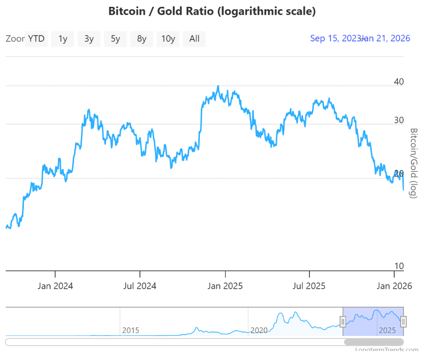 2026 elején a befektetői preferenciák világosan kirajzolódnak. Az arany történelmi csúcsokra emelkedett, miközben a Bitcoin–arany arány két éve nem látott mélypontra süllyedt.