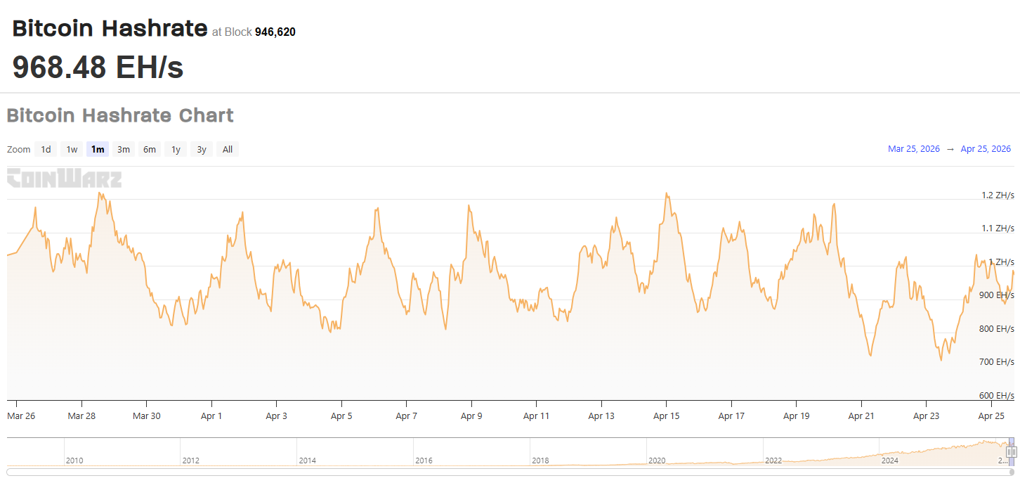 A Bitcoin hálózat számítási teljesítménye, vagyis hash rate-je jelenleg 30 napos átlagban 968,4 EH/s, ami körülbelül 7,5%-kal alacsonyabb a tavaly november végén látott történelmi csúcstól.