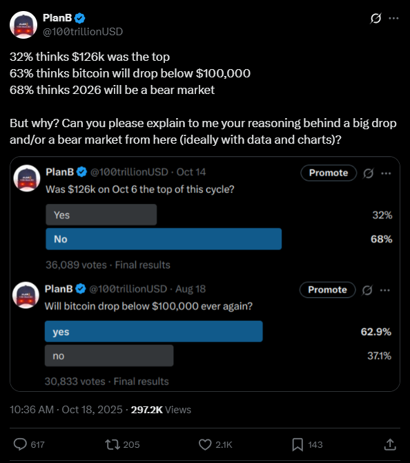 Ott a válaszadók 63%-a arra számított, hogy a Bitcoin visszaeshet 100 ezer dollár alá. Ez a pesszimizmus azonnal magyarázatok keresésére ösztönözte a kriptoközösséget.