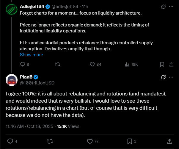 A közösségi médiában ismert szakértő, Adlegoff84, úgy fogalmazott, a Bitcoin árfolyama ma már nem a természetes kereslet és kínálat tükre, hanem az intézményi likviditási manővereké.