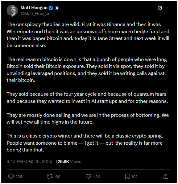 Matt Hougan, a Bitwise befektetési igazgatója szerint a visszaesés fő oka nem összeesküvés vagy rejtett manipuláció, hanem egyszerűen az, hogy sok korábbi long befektető zárta pozícióit.