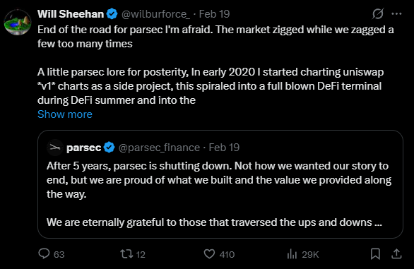 Az on-chain elemzéssel foglalkozó Parsec öt év után bezárja kapuit — ez azt mutatja, hogy a kriptoeszközök piacának egy része már nem felel meg a kereskedők igényeinek.