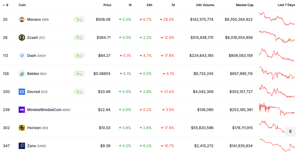 Miközben a szélesebb piac már korábban is gyengélkedett, a privacy coin szektorban az eladási nyomás egyszerre erősödött fel, és több nagy token is kétszámjegyű esést könyvelt el.