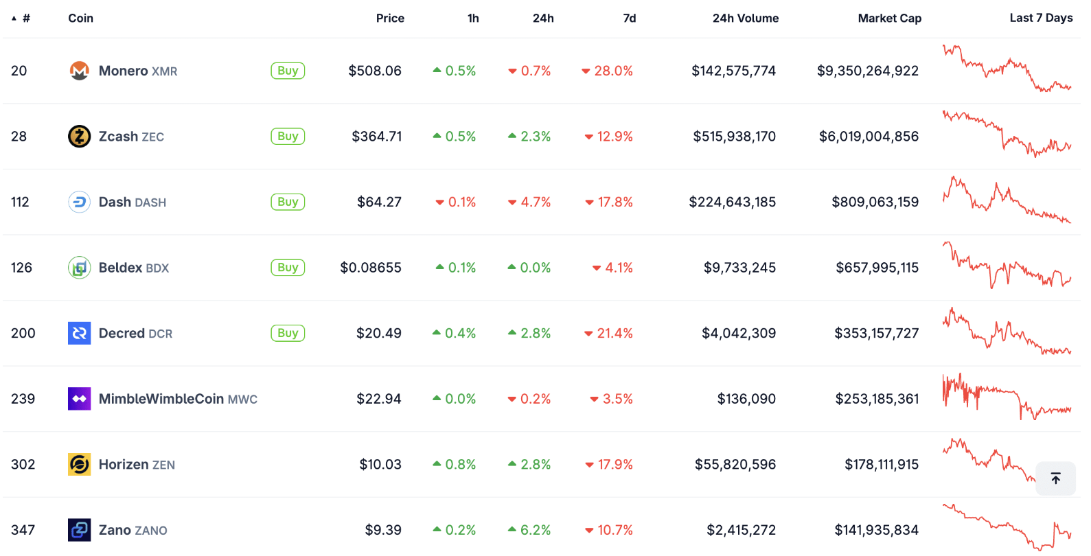 A közepes és kisebb piaci kapitalizációjú privacy tokenek szinte kivétel nélkül követték a nagyok mozgását.