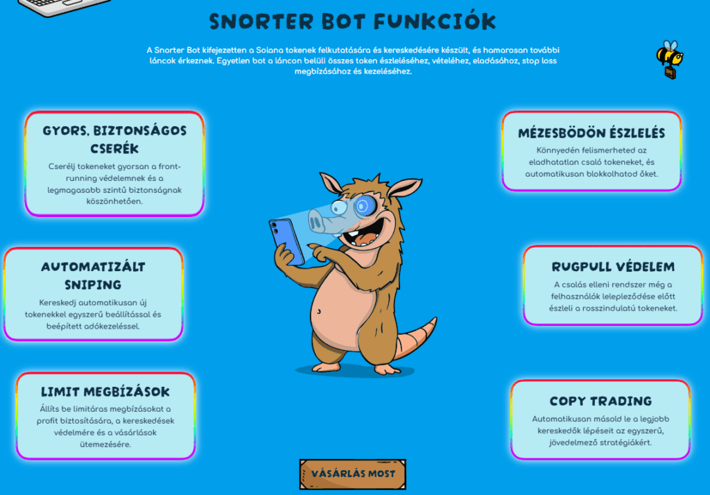 A Snorter Bot Token előnye a Banana Gunhoz képest az, hogy a Solanára épül, így villámgyorsan működik, és nem terheli az Ethereumra jellemző lassúság vagy a magas hálózati költségek.