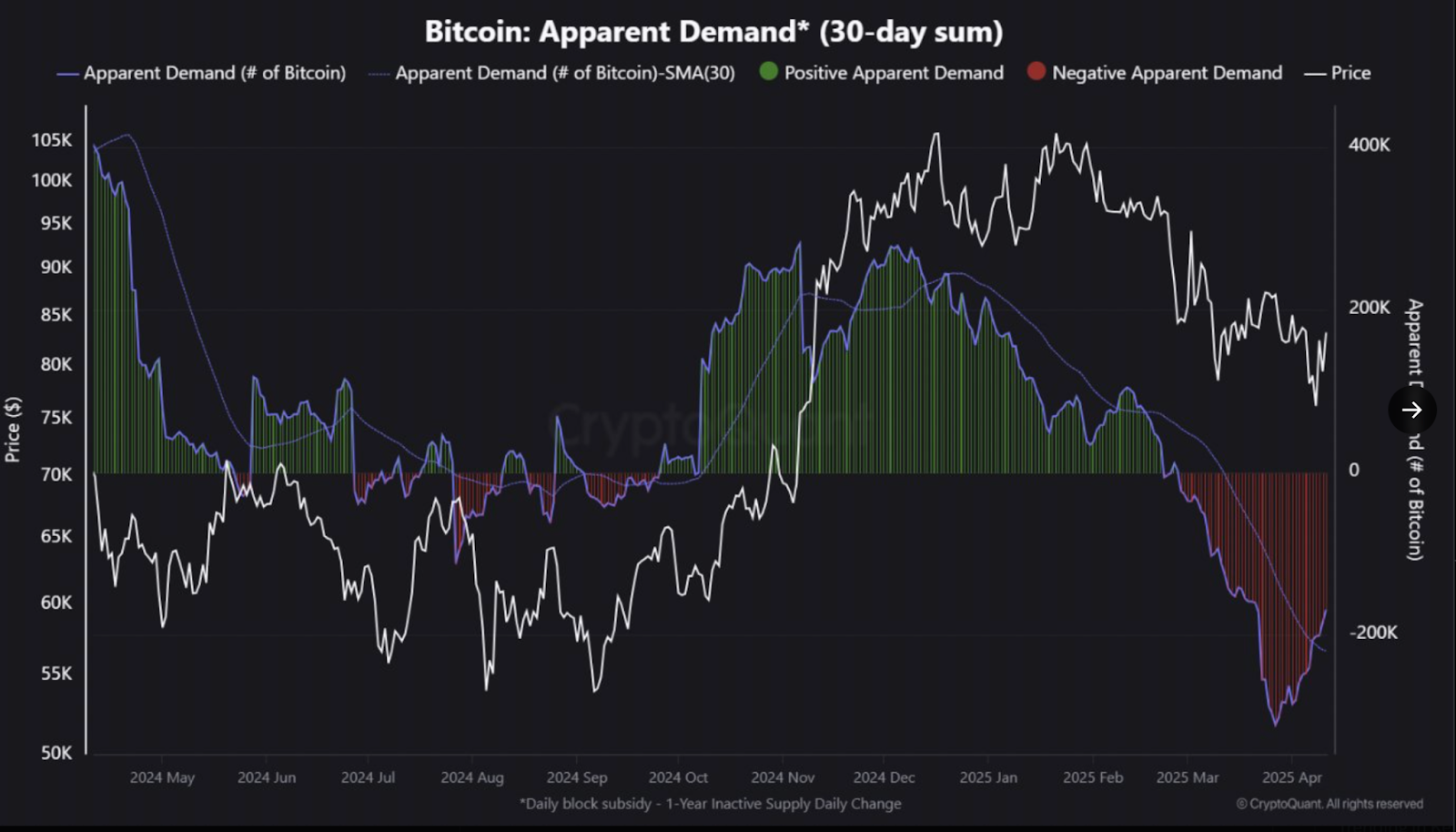 Hetekig tartó visszafogott érdeklődés után a bitcoin 30 napos keresleti mutatója végre emelkedni kezdett a március–áprilisi mélypontokról. Ez egy lehetséges piaci fordulatra utal.
