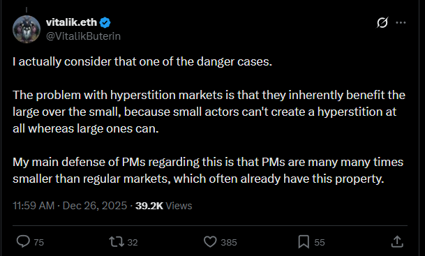 Buterin szerint a valóságot alakító piacok inkább a nagy szereplőknek kedveznek, mint a kicsiknek.