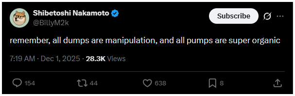 Ezzel szemben — mutatott rá — amikor egy token gyorsan és látványosan emelkedik, akkor a legtöbben „organikus növekedésnek” nevezik, és úgy ünneplik, mintha teljesen természetes folyamatról lenne szó.