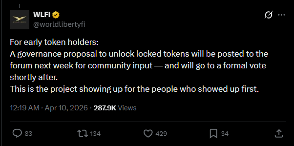A World Liberty Financial új javaslatot készít elő a WLFI tokenek felszabadításáról, ami első ránézésre előrelépésnek tűnhet, a részletek alapján azonban inkább egy lassabb, fokozatos megoldás körvonalazódik, mintsem egy azonnali feloldás.