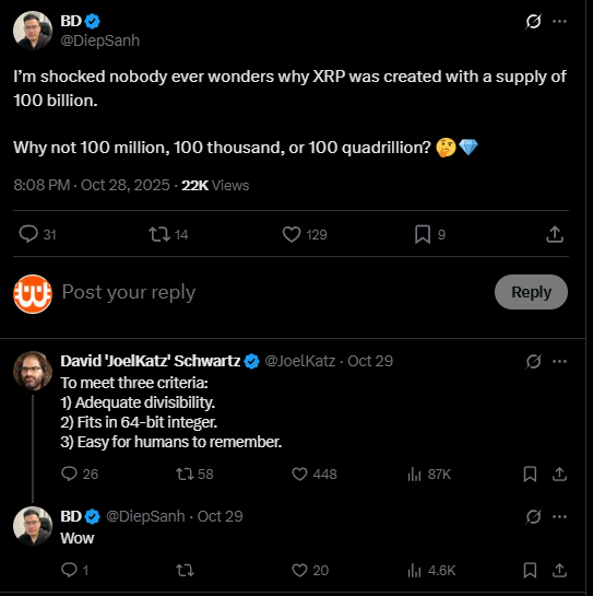 Schwartz szerint az XRP 100 milliárdos kínálatának harmadik oka, hogy ez a szám könnyen megjegyezhető.
