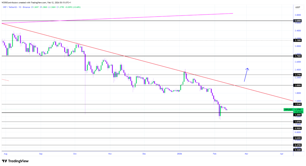 Miután 2025 végén megközelítette a 3,20–3,80 dolláros sávot, az XRP/USD 2026 februárjára visszahúzódott az 1,30–1,40 dolláros zónába.