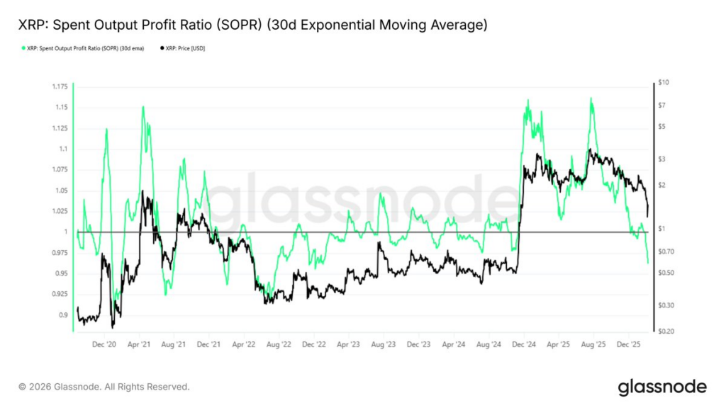 Az XRP Spent Output Profit Ratio (SOPR) mutatója, 30 napos EMA alapján mérve, az 1-s semleges szint alá esett, jelenleg 0,96-on áll.