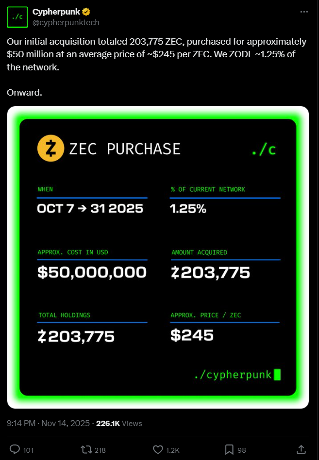 Az elmúlt hetekben jelentős pozíciók épültek fel: a Cypherpunk Holdings közel kétszázezer ZEC-et vásárolt, ötvenmillió dollár értékben, miközben a Grayscale Zcash Trust vagyona elérte a kétszázmillió dollárt.