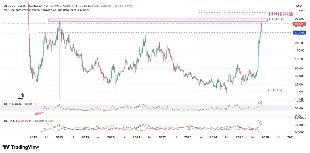 A Zcash (ZEC) árfolyama jelenleg nagyjából 693,11 dollár körül mozog, miután 24 óra alatt több mint 16%-ot ugrott, és új csúcsot is kialakított 700 dollár felett.